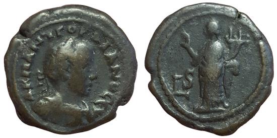 Obv: Α Κ Μ ΑΝ ΓΟΡΔΙΑΝΟϹ ƐΥϹƐΒ, laureate and cuirassed bust of Gordian III, r., seen from front, with gorgoneion Rev: Homonia standing l., raising r. arm, holding double cornucopia, LϚ = year 6.
