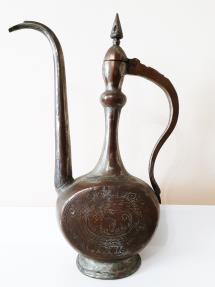 IRAN, PERSIA: 19th century Qajar era Persian Islamic Copper Ewer Pitcher! It is made of tinned Copper. Hand chased decoration either side of 3 animals in a cartouche, Birds & flowers. It is inscribed " Halima Khatoon حلیمه خاتون " . Size: 38 cm high. Natural aging in good condition. Shipping to US & Canada only! |