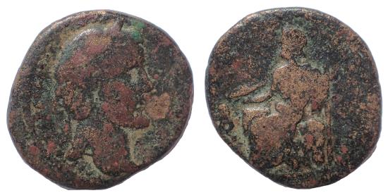Cyrrhus, Antoninus Pius. Ae 23 mm. 9.2 gm. Obv: ΑΥΤοΚΡΑΤⲰΡ ΚƐϹΑΡ(sic) ΤΙΤ ƐΛΙ(sic) (ΑΔΡΙ) ΑΝΤⲰΝΙΝΟϹ Ϲ(Β ƐΥ(ϹƐ)), laureate head of Antoninus Pius, r. Rev: ΔΙΟϹ ΚΑΤΑΙΒΑΤΟΥ ΚΥΡΡΗϹΤⲰΝ and numeral letter Α or Β in r. field or exergue, Zeus Kataibates seated on rock, l., holding thunderbolt over eagle and long sceptre. Cop 45, RPC IV.3 8539. Rare. |