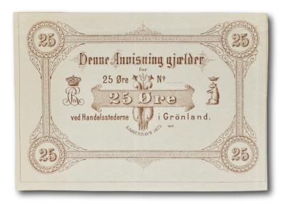 Greenland, 25 øre dated 1875. Grading: XF. Reference: Pick A39 r (remainder).  Protocol no. 3014