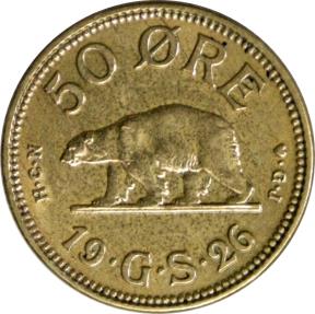 Greenland, 50 øre dated 1926, struck for the Danish Administration of Greenland. Very Fine condition. KM 7. 3,85 g. Protocol no. 2516