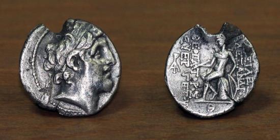Seleukid Empire AR Drachm, Alexander I Balas 151-149 BC, Antioch on the Orontes. (CUT) OBV: Diademed Alexander I Balas to right. REV: Apollo seated on omphalos, holding arrow & resting hand on grounded bow; "ΒΑΣΙΛΕΩΣ ΑΛΕΞΑΝΔΡΟΥ" to right, "ΘΕΟΠΑΤΟΡΟΣ ΕΥΕΡΓΕΤΟΥ" to left, two monograms to outer left & below of the Apollo seated. Weight: 3.90gm Size: 18mm Very Fine & Good Very Fine.