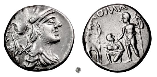 Helmeted and draped bust of Mars right; X (mark of value) behind / Oath scene: kneeling youth holding pig, between two soldiers, each of whom holds a spear and sword