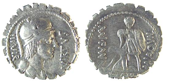 | TCRRS-3547, Mn. Aquillius Mn.f.Mn.n. AR 3.94 gm, Denarius, c.71 BC, grams), Obv. Virtus helmeted bust to right, VIRTVS III.VIR around, Rev: Consul Man. Aquillius raising Sicilia, MN AQVIL MN F MN N to left and right, SICIL in exergue. Rome Mint. S.226, Cr. 401/1, Syd.798, B. Aquillia 2. Off centered on obverse, a serrated edge, gVF and scarce. Type refers to the successes in Sicily of Man. Aquillius (consul 101 B.C.) and to the exceptional valor which he displayed throughout the war. |