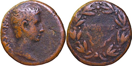 TCRIB-80, AUGUSTUS, AE, AS, 10.08 gm, Obv: bare head right, CAESAR, Rev: AUGUSTUS in one line in laurel wreath. RIC-486, SCARCE, aVF,