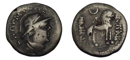 ANCIENT BAKTRIA INDIA & CHINA : YUEH-CHI. Sapadbizes, late 1st century BC. AR Drachm (1.77g), Draped bust to right, wearing crested Macedonian helmet adorned with bull’s horn and ear. Rev. Lion standing to right with open jaws; to left, NANAIA; to right, NANAIA; above crescent above Λ; all withing dotted border. Good Very Fine, Beautifully toned example. similar type was sold for 550 CHF at Leu Numis. |