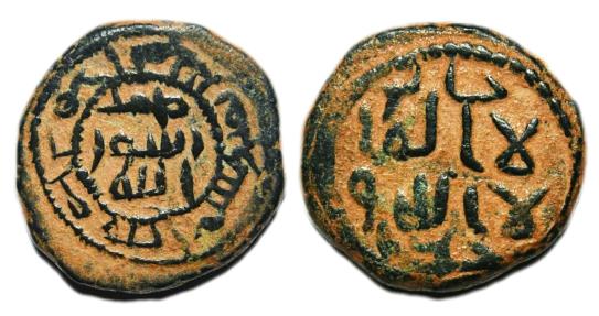 ISLAMIC UMAYYAD CALIPHATE: AE fals, Mint: Manbij, ND, A-183, W-—, Zeno-130927, reverse legend clockwise, Unpublished type with Extra Ja'iz Word on obv, very rare mint unknown to Walker for the post-reform period, Extremely Rare in this Extremely Fine quality, finest style, superb strike on very broad planchet, delightful patination, RRR.