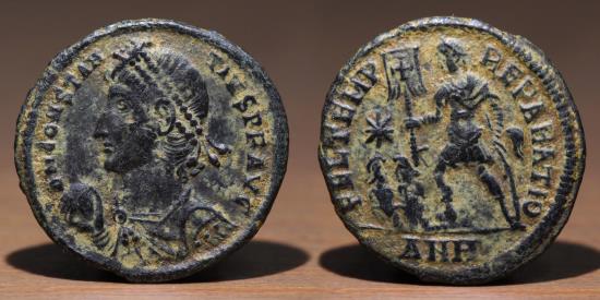 Roman Empire AE Follis, Constantius II Maiorina (337-361 AD), Antioch mint. OBV: "DN CONSTANTIVS P F AVG"; Diademed, draped and cuirassed bust left. REV: "FELTEMP REPARATIO"; "ANH"; in exergue, Constantius II standing left, holding labarum and resting hand on shield; two captives to left, "STAR" to left. Weight: 3.63gm Size: 21mm Nice Small Sand Patina, EF.