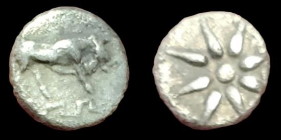 Obv. Bull butting right, below, meander
