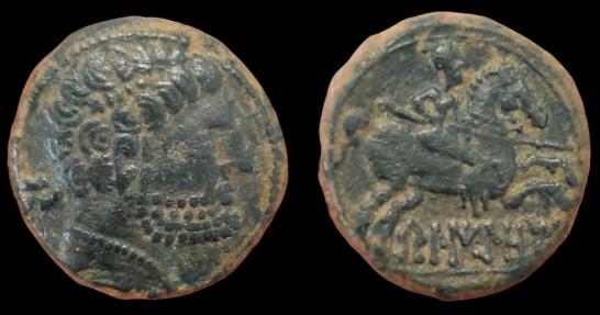 Iberia, Belikio Æ 24mm. 100-65 BC. Bearded male head to right; BE (in Iberian script) behind / Warrior on horseback to right, holding spear; BELIKIOM (in Iberian script) below.