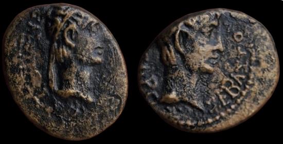 Thrace, Kings of. Rhoemetalkes I and Augustus. Circa 11 BC-12 AD. Æ. 20mm, 4.05g. Diademed head of Rhoemetalkes right / Bare head of Augustus right. RPC 1718; Youroukova 200 (Rhoemetalkes II).