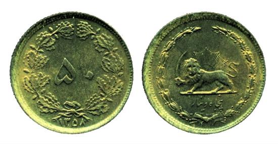 | IRAN, PERSIA: No crown 50 dinar (20 mm), Issue of Provisional government, SH 1358 (1979), the only type with lion and the sun, Short one year type, made of Brass clad Steel, KM# 1231 , RARE, UNC! |