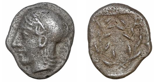 AEOLIS. Elaia. Diobol (Circa 450-400 BC). 1.20 gr. – 10.5 mm. O:\ Helmeted head of Athena left. R:\ EΛΑΙ. Laurel wreath within incuse square. SNG München 382. XF+