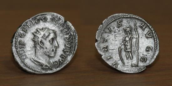 Roman Empire, Gallienus, AR Antoninianus, 253-268 AD, Rome mint. Obv: "IMP C P LIC GALLIENVS AVG"; radiate, draped and cuirassed bust right. Rev: "VIRTVS AVGG"; Virtus standing left, holding spear and shield which rests on ground.