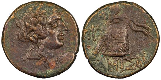 AE21 7.20g. 21mm. Struck under Mithradates VI Eupator. Head of Dionysos r., wearing mitra and ivy wreath. Thyrsos leaning against cista mystica draped with panther skin; legend below; monogram to l. AMISOU HGC 7, 243; SNG Black Sea 1200-9 Brown patina. Some green adhesions/corrosion at edges. From the Southwood Collection.