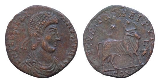 Barbaric Imitation . Æ23mm 5.3g, Arelate 361-363. D N FL CL IVLI – [ANVS P F AVG] Pearl- diademed, draped and cuirassed bust r. Rev. SEC[VRITAS REIPV]B Bull standing r.; above, two stars and before, eagle with wreath in its beak. In exergue, TCON2T·. C cf. 39. RIC cf. 318.