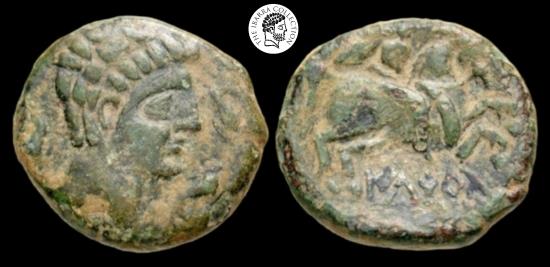 Iberia, Iltirta. After 104 B.C. AE 23 (23.8 mm, 10.26 g, 4 h). Bare male head right; three dolphins round / 'Iltirta', Herseman riding right, holding palm branch. ACIP 1256; SNG BM Spain 625-8. Near VF, earthen green patina.