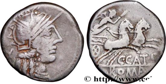Reverse : C. CATO// ROMA Victoria (la Victoire) dans un bige galopant à droite, tenant une couronne de la main droite et les rênes de la main gauche