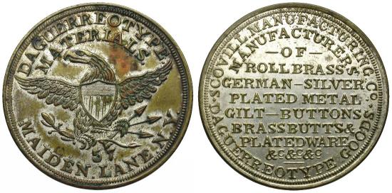 Obverse: DAGUERREOTYPE / MATERIALS / 57 / MAIDEN LANE N Y, eagle, wings spread, head left, shield on chest, arrows and laurel branch in talons