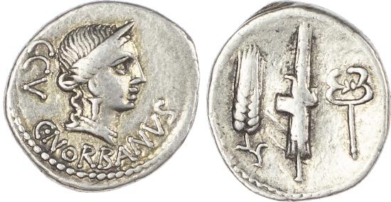 Roman Republic. C. Norbanus (83 BC). Silver Denarius, mint of Rome. Obverse: C NORBANVS CCV, diademed head of Venus facing right. Reverse: Fasces with axe, ear of grain and caduceus. (Crawford 357; Sydenham 739). Good Very Fine. Pleasing iridescence. 3.89g. |