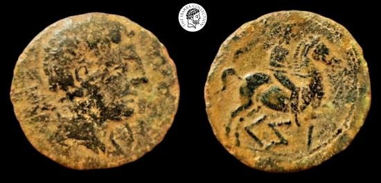 Draped male bust right; club behind / Horseman galloping right,