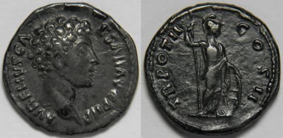 Roman Empire Marcus Aurelius as Caesar AR Denarius (Rome, AD 147-148) Bare head right / Minerva standing right, holding spear and resting hand upon shield. 3.01 grams, 18 mm. Good Very Fine. Dark tone. RIC 438b (Antoninus Pius), RSC 608. Purchased from Biga Numismatics. |