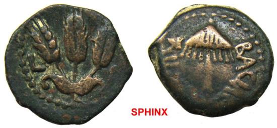 472RC9X) HERODIAN KINGS of JUDAEA. Agrippa I. 37-44 CE AE Prutah (17 mm, 3.11 gm). Dated year 6 (41/2) CE. BACILEWC AGRIPA, umbrella-like canopy / Three ears of barley between L S