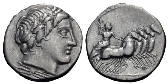 Obverse: Laureate head of Apollo right; thunderbolt below.