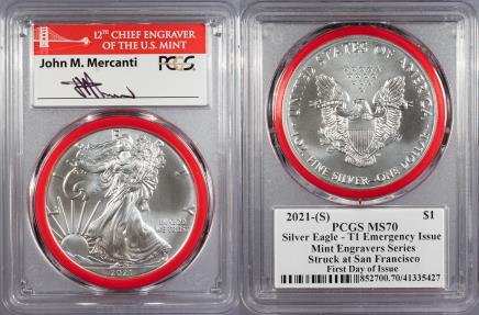 2021-(S) Silver Eagle; Type 1 1 Dollar (Silver) Emergency Issue; First Day of Issue PCGS MS-70