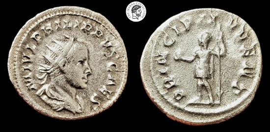 | Philip II, as Caesar, AR Antoninianus. Rome mint, AD 244-246. Obv. M IVL PHILIPPVS CAES, radiate, draped and cuirassed bust to right. Rev. PRINCIPI IVVENT, prince standing facing, head to left, holding globe and spear. 4.18g, 23mm. RIC IV 218d. Very Fine. Nice portrait. |