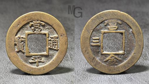 Korean AE cash. Sang Pyong Tong Bo. Obv: cursive script TONG, hooks in PYONG. Rev: above YONG, left 3, below KUM (metal), 1752.