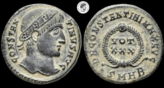 | Constantine I. AD 307/310-337. Æ Follis. Heraclea mint, 2nd officina. Struck AD 327-329. CONSTAN TINVS AVG, head right, wearing plain diadem, eyes to God / D N CONSTANTINI MAX AVG, VOT/ XXX in two lines within laurel wreath; •SMHB. 18mm, 2.91g. RIC VII 92. Beautiful Details, earthen deposits, Very Fine. |