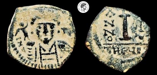 | Justin II, 565-578 AD, AE Decanummium, Theupolis (Antioch), year 1 (565 AD), helmeted and cuirassed bust facing, holding Victory on globe and shield // large I (10 nummi) flanked by ANNO and I, cross and star above, THEUP in exergue. 17mm, 3.17g. SB 382. Lovely desert patina, VF. |