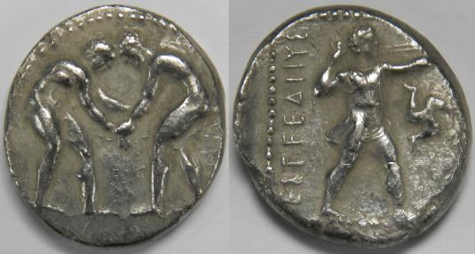 Pamphylia Aspendos AR Stater circa 400-380 BC Two wrestlers grappling / Slinger in throwing stance right; to right, triskeles to left. 10.39 grams, 22 mm. Very Fine. Tekin Series 3, SNG France 54, BMC -, SNG von Aulock 4541-4543, SNG Copenhagen 190-195. Purchased from N&N London. |