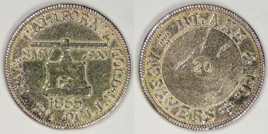 Blake & Co. Assayers, Sacramento California, 1855 Faux Gold $20