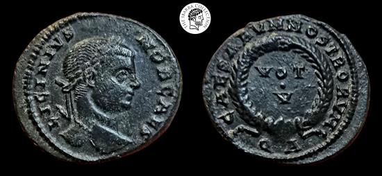 LICINIUS II, Caesar. 317-324 AD. AE Follis. Arles mint. Struck 321 AD. LICINIVS NOB CAES, laureate head right / CAESARVM NOSTRORVM, VOT/V in two lines within laurel wreath; QA. 17mm, 2.93g. RIC 231. Very Fine.