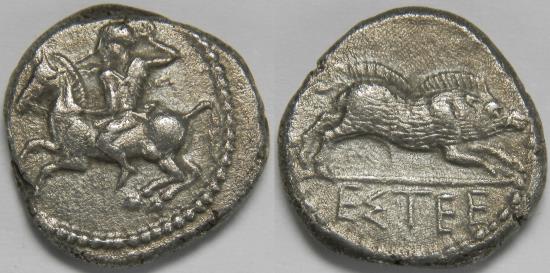 Pamphylia Aspendos AR Drachm circa 420-360 BC Warrior (Mopsos) on horseback left, brandishing spear / Boar standing right. 5.35 grams, 17 mm. About Extremely Fine. Well centered and struck, without the usual countermarks. Exceptional for issue. Very rare. Slightly granular surfaces. SNG France -, BMC 10, SNG von Aulock 4488 (same dies), SNG Copenhagen -. Purchased from Rex Numismatics, Rotterdam. Video: https://youtu.be/ZFspqPREyKk This coin illustrates the founding myth of Aspendos. According to it, the Greek hero Mopsos once came to the region of Aspendos. There were plenty of wild boars because the Eurymedon River that flows through this area had created a marshy landscape at its mouth. Wild boars love swamps in which they can wallow with relish. However, a city founder like Mopsos had to prove that he could keep the pests of agriculture – such as wild boars – at bay before founding a city that depended on the yields from its fields. Wild boars can wipe out months of farmers' labor in a single night. In fact, Mopsos managed to kill a large boar on one of the fast and enduring horses Aspendos was famous for. He sacrificed the killed boar to the patron god of Aspendos, a twin Aphrodite (Aphroditai Kastnietides). As a result of this first sacrifice, pigs were offered to this twin Aphrodite until the demise of the ancient religion. Mopsos did this on a hill above the Eurymedon River, where he then founded the Greek city of Aspendos (from Künker Auction 402, lot 359, which was with same dies, hammered for 5000 EUR). |