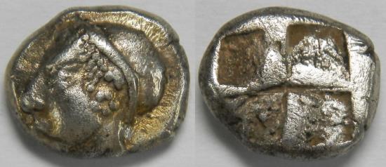 Female head left, wearing helmet or close fitting cap / Quadripartite incuse square.