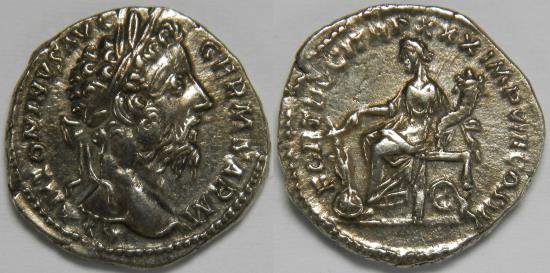 Roman Empire Marcus Aurelius AR Denarius (Rome, AD 175-176) M ANTONINVS AVG GERM SARM, laureate head to right / FORT DVCI TR P XXX IMP VIII COS III, Fortuna seated to left on throne, holding cornucopiae and rudder set upon globe; wheel below. 3.50 grams, 18 mm. About Extremely Fine. RIC 343, RSC 203. Purchased from Rex Numismatics, Rotterdam. |