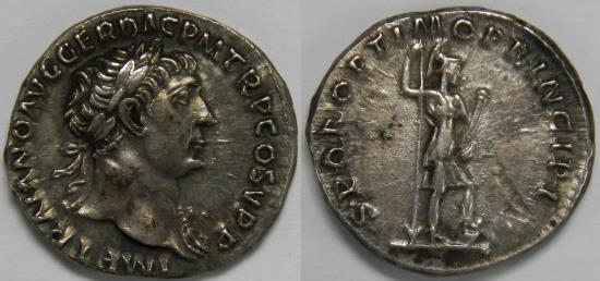 Roman Empire Trajan AR Denarius (Rome, AD 104-107) Laureate bust right, wearing aegis / Mars standing right, holding spear and parazonium, foot on helmet. 3.44 grams, 17 mm. About Extremely Fine. Dark tone. Flan flaw on the reverse. RIC 203, RSC 402b. Purchased from Aphrodite Art Coins, Germany. |