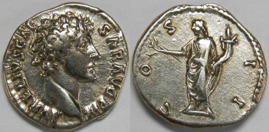 Roman Empire Marcus Aurelius as Caesar AR Denarius (Rome, AD 145-147) Bare head right / Honos standing left, holding branch and cornucopia. 3.31 grams, 17 mm. About Extremely Fine. Bright. RIC 429a (Antoninus Pius), RSC 110. Purchased from Rex Numismatics, Rotterdam. |