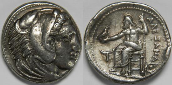Kingdom of Macedon Alexander III (the Great) AR Tetradrachm 336-323 BC Head of Herakles right, wearing lion skin / Zeus Aëtophoros seated left; boukranion in left field. Lifetime issue. Struck in circa 325-323 BC, Amphipolis. 17.16 grams, 24 mm. About Extremely Fine. Lovely brown patina. Light scratches and tiny edge bumps on the reverse. Price 93. Purchased from Ancient Numismatics Auction, Germany. Video: https://youtu.be/s0sJ0rb0bT8 |