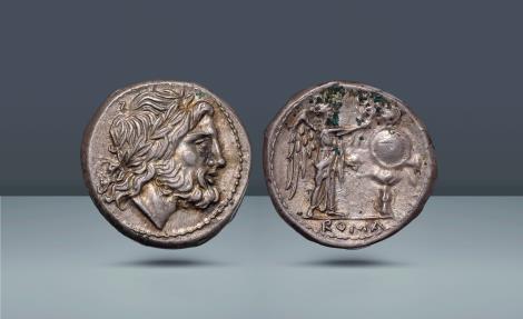 Issued during the Second Punic War, and featuring a divine portrait of fine style, this anonymous republican denarius is packed with imagery quite befitting a nation at war. The obverse depicts a laureate portrait of Jupiter, Rome’s central deity. In this version, Jupiter is crowned victorious with a laurel wreath. With its origins clouded in myth and history, but potentially dating back to the earliest Ancient Greek Olympic and Pythian games, certainly by Roman times the laurel wreath signified victory and strength. Compounding this sense of triumph, the reverse design shows the robed figure of Victory as she crowns a military trophy. Quite simply this coin is proclaiming Rome has been, is, and will be victorious over their arch enemy the Carthaginians! |