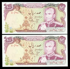 | IRAN, PERSIA: 2 Consecutive 100 Rial Maroon Banknote, Issued SH 1353 (1974) by Central Bank aka Bank Markazi, Pick-102a, Muhammad Reza shah Pahlavi (1941-1979), Pahlavi Museum on the back, Signature Ansary - Yeganeh, Gem UNC. Pair! Printed by British Company Thomas De La Rue. |