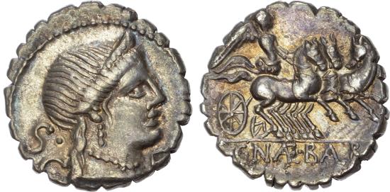 Roman Republic. C. Naevius Balbus (79 BC). Silver Denarius Serratus, Rome. Obverse: Diademed head of Venus right, S•C behind, K to right. Reverse: Victory, holding reins, driving triga right, IXXXII above, C•NAE•BALB in exergue. (Crawford 382/1a; Sydenham 769). Extremely Fine. 3.83g. |