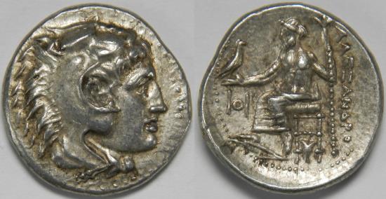 Kingdom of Macedon Alexander III (the Great) AR Drachm 336-323 BC Head of Herakles right, wearing lion skin / Zeus Aëtophoros seated left; monogram in left field, rose below throne. Lifetime issue. Struck in circa 324-323 BC, Sardes.