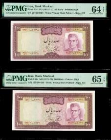 | IRAN, PERSIA: 2 Consecutive 100 Rials Maroon Banknotes, Issued SH 1350 (1971) by Central Bank aka Bank Markazi, Pick-91c, Muhammad Reza shah Pahlavi (1941-1979), Abadan Refinery on the back, Signature Amouzegar-Jahanshahi, Super Gem Unc. Pair! Certified by PMG-65 & 64, Printed by British Company Harrison. |