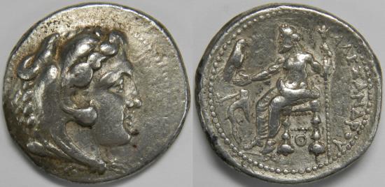 Kingdom of Macedon Alexander III (the Great) AR Tetradrachm 336-323 BC Head of Herakles right, wearing lion skin / AΛEΞANΔPOY, Zeus Aëtophoros seated left; plow in left field, Q under throne, globule in inner right field. Lifetime issue. Struck in circa 327-323 BC, Tarsos. 17.10 grams, 27 mm. Very Fine. Minor marks and small deposit on obverse and edge. Price 3019, Müller 1284. Purchased from Solidus Numismatik, München. |
