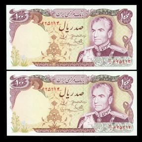 | IRAN: 2 consecutive Shah Pahlavi 100 Rial Banknote, Pahlavi Museum, 1974, Gem UNC. Pair! |