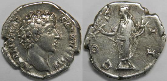 Roman Empire Marcus Aurelius as Caesar AR Denarius (Rome, AD 145-147) Bare head right / Honos standing left, holding branch and cornucopia. 3.48 grams, 18 mm. Good Very Fine. Edge splits. RIC 429a (Antoninus Pius), RSC 110. Purchased from Concordia Numismatics, Austria. |